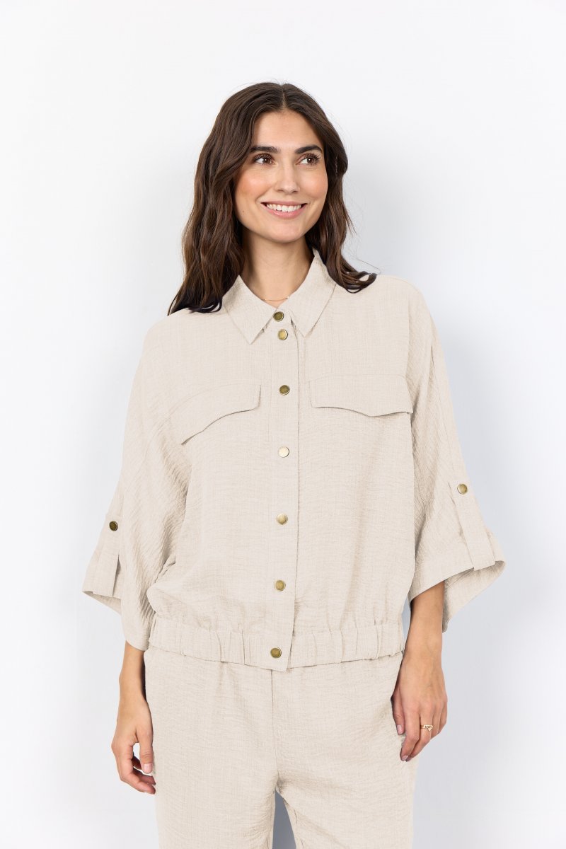 Jakke fremstillet af 100% genbrugspolyester. Den har en klassisk krave, knaplukning foran og to forlommer med elastik forneden. Sæt den sammen med jeans eller bukser for et elegant og cool casual look.