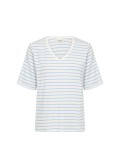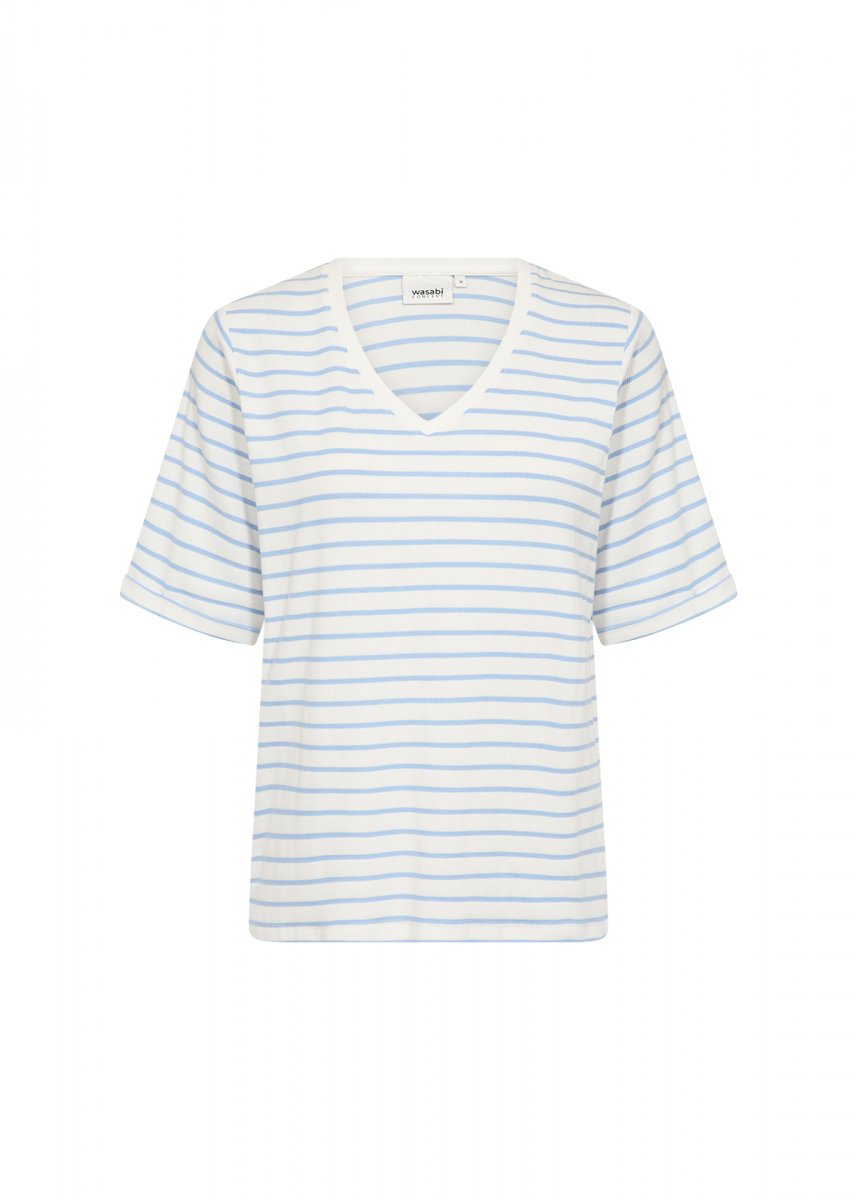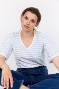 Basis-T-shirt fremstillet af 65% genanvendt bomuld, 30% LENZING™ ECOVERO™-viskose og 5% elastan. Den har V-hals og et gennemgående stribet print. Sæt denne cool og unikke T-shirt sammen med jeans eller shorts for et afslappet look.